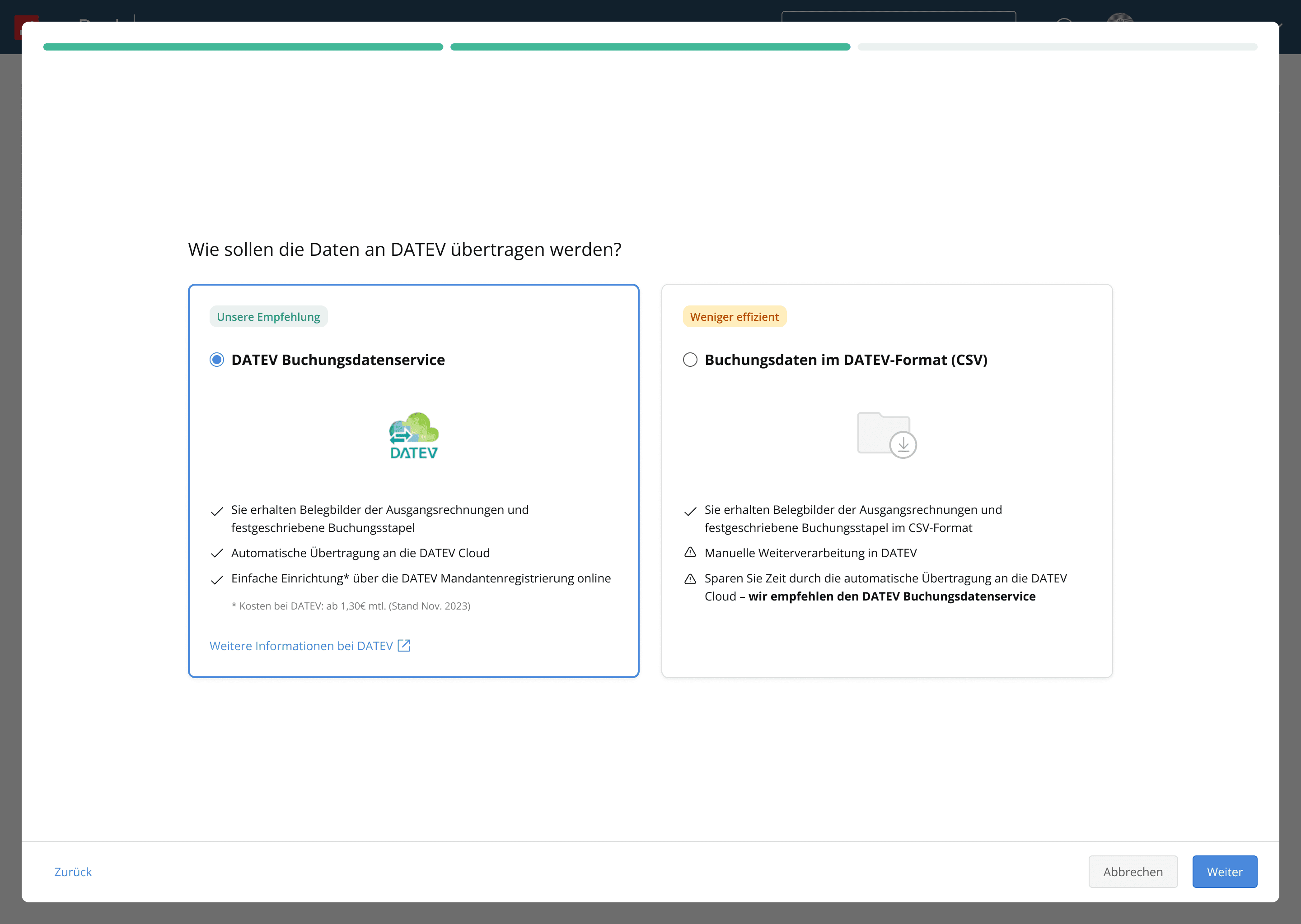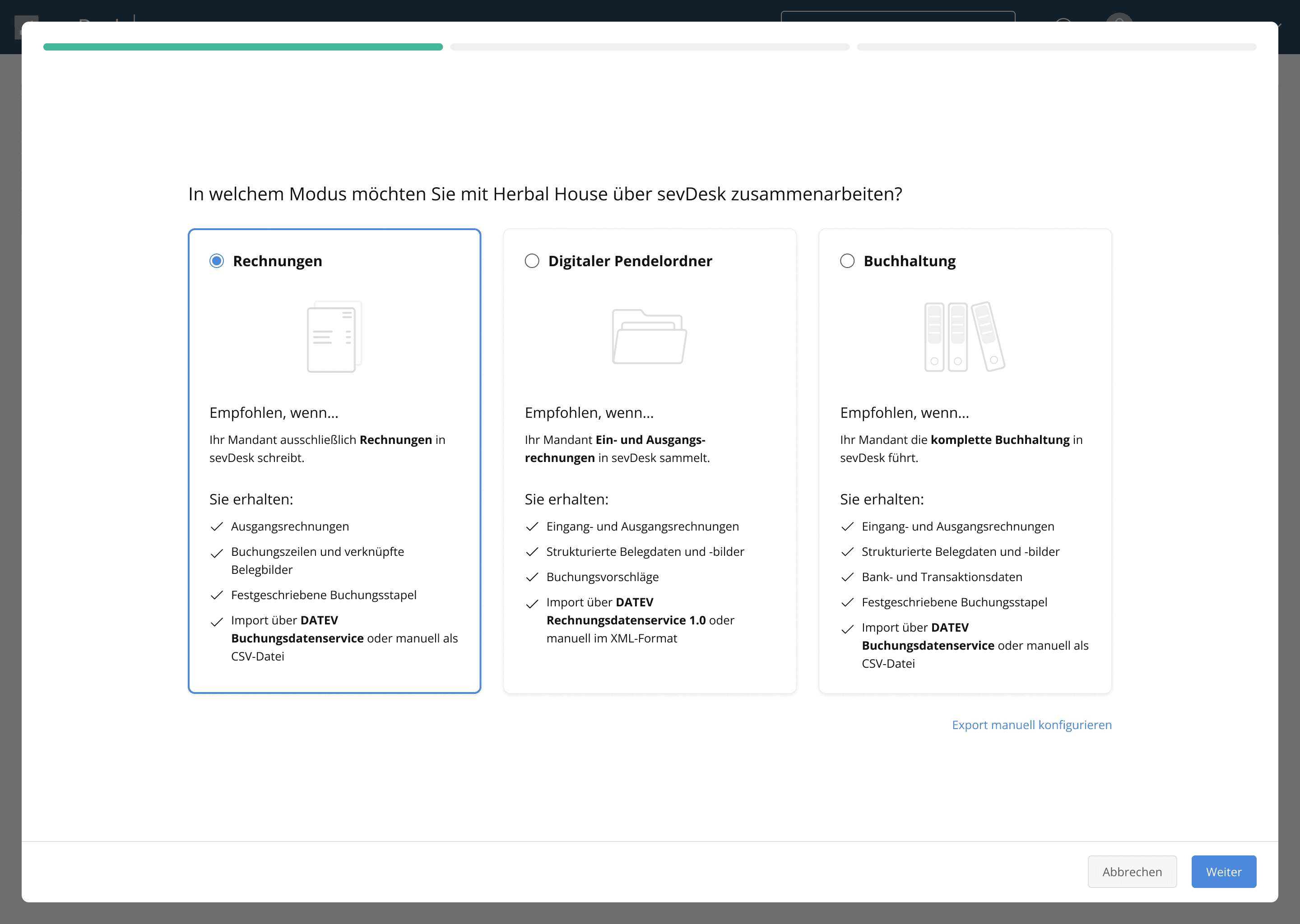 Choose the export method, either manual or automated through a DATEV export service.