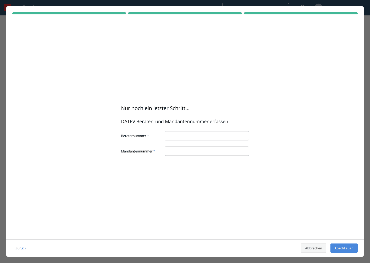 Enter required DATEV identifiers, including advisor and client IDs.