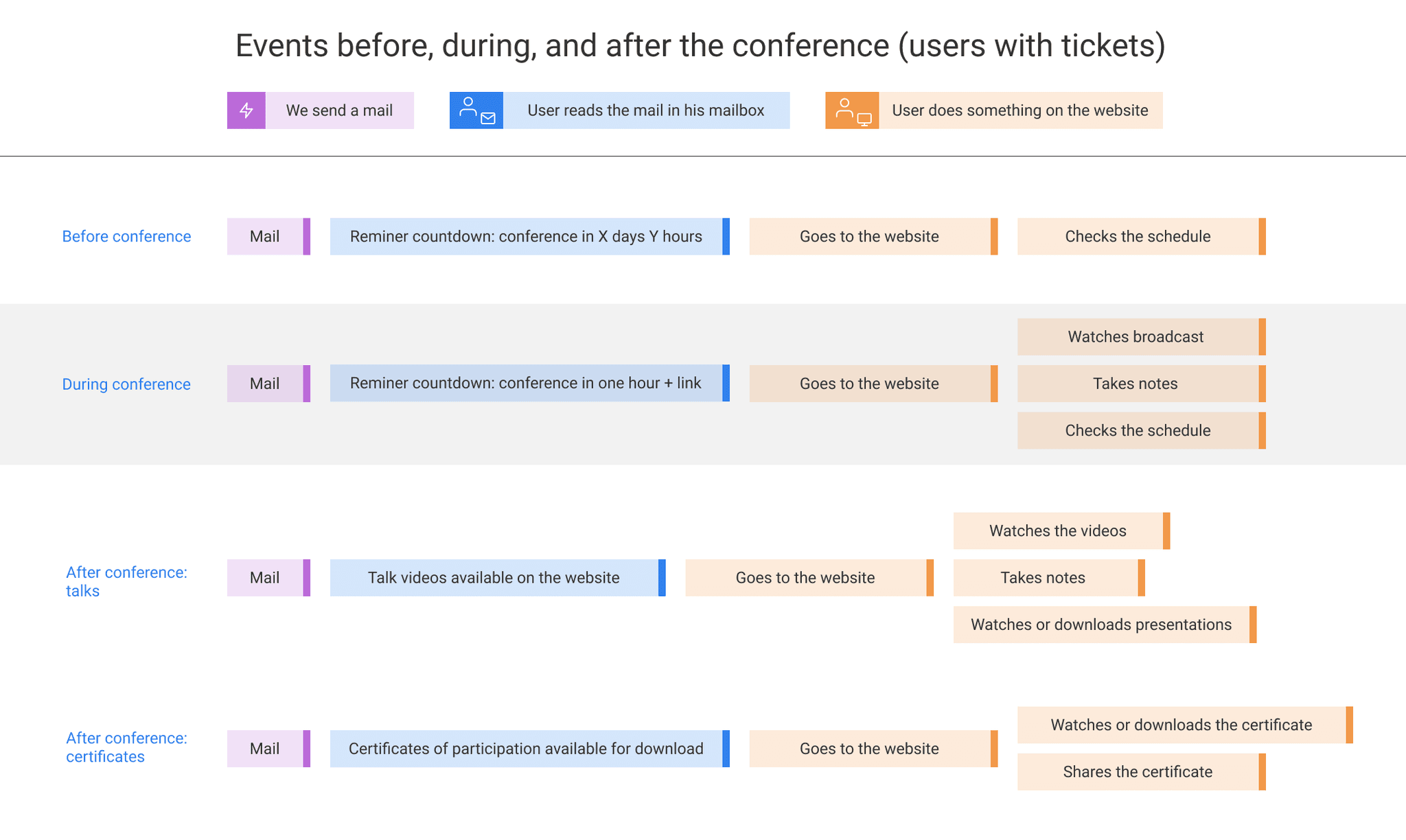 Creating a journey map helped us clarify the full user flow, from signing up to watching talks and getting a certificate.
